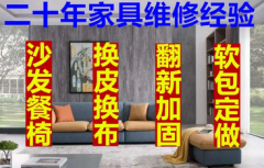 主要项目有:1、沙发翻新:专业修沙发、修沙发座塌陷不平、换坐黄、换拉簧、换海绵、换绷带、木架加固2、沙
